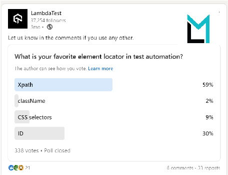 According to a recent LambdaTest poll, 59% of participants chose XPath over alternative element locator, making it the most popular locator for test automation.